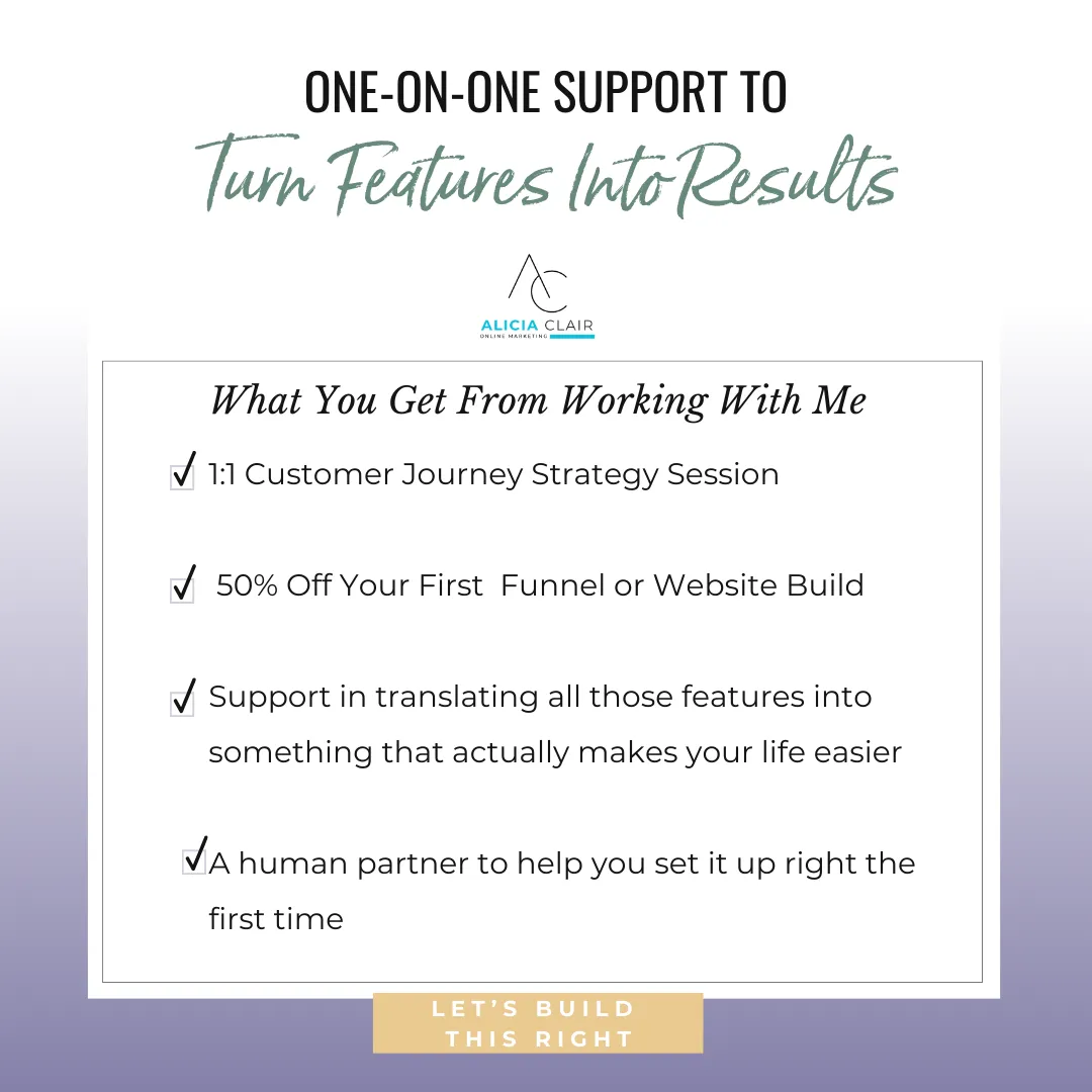 3. If it’s a good fit, I’ll walk you through next steps. I’ll share a personalized plan and offer to build your first funnel or website for 50% off. If you’re not ready yet, no hard feelings—you’ll still leave with more clarity than you had before.